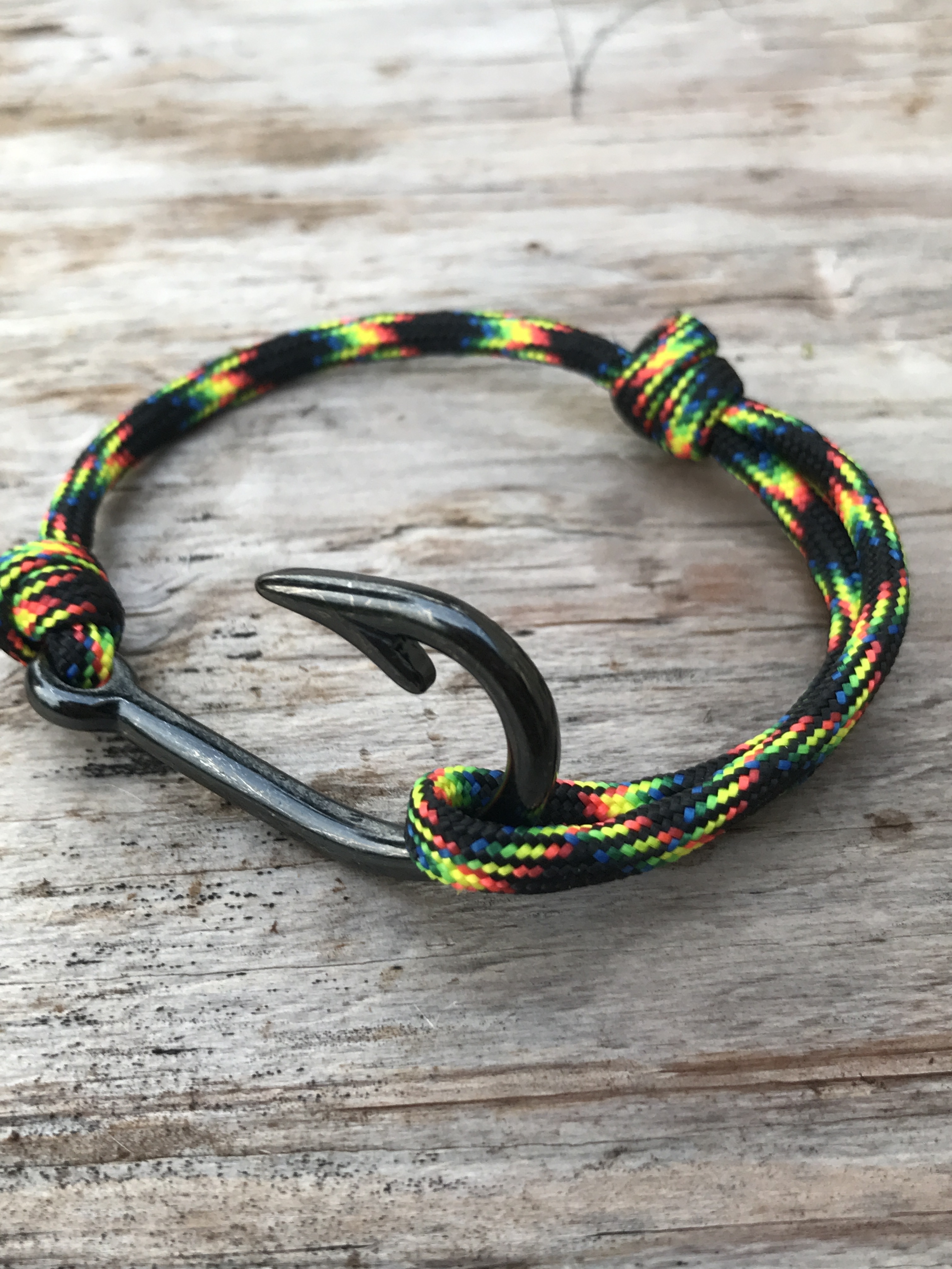 → Wrap the paracord around your wrist until the hook meets the loop. Make adjustments to the sliding knot (the knot that makes the loop) until it is fully adjusted to your wrist size.